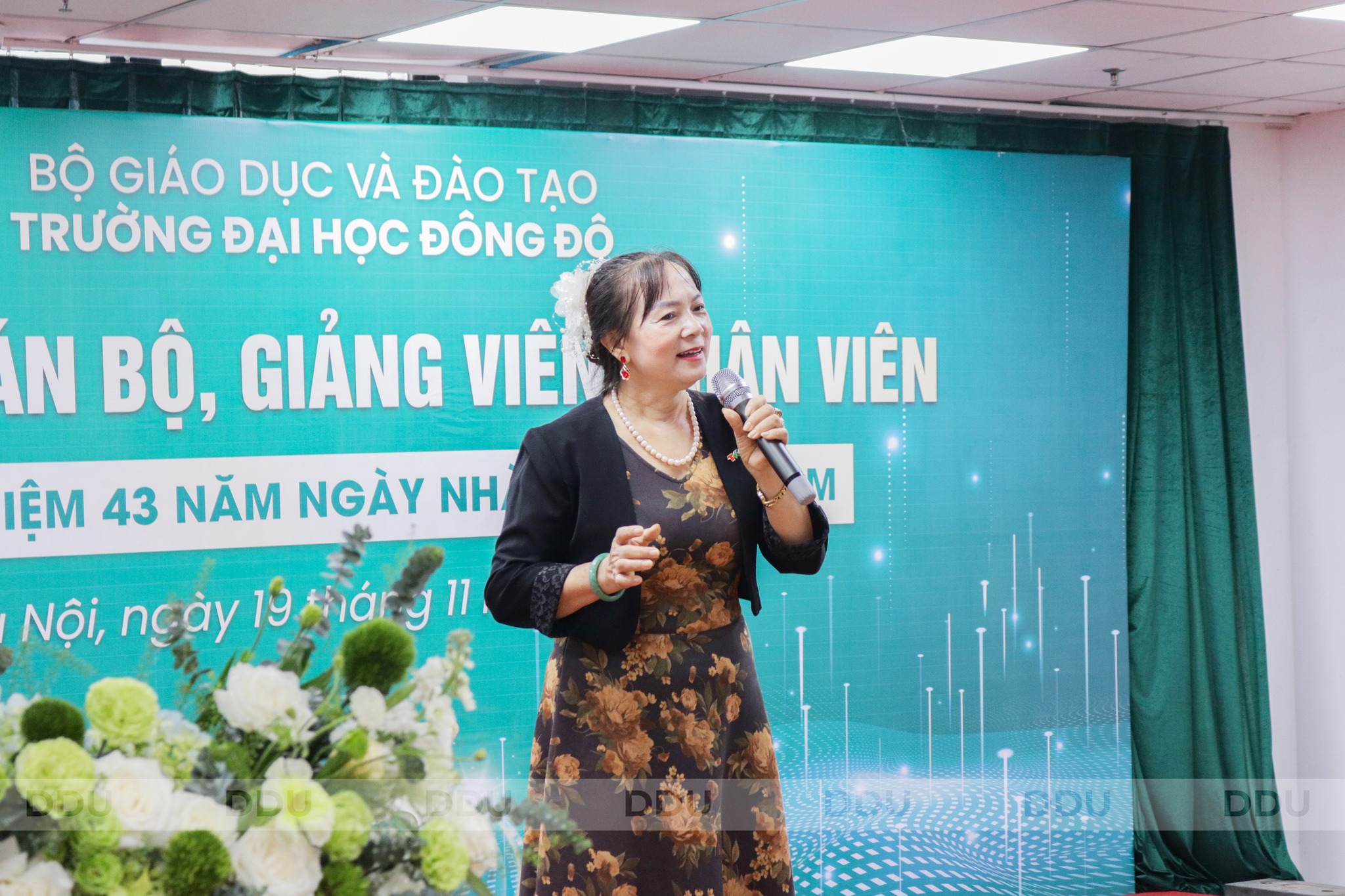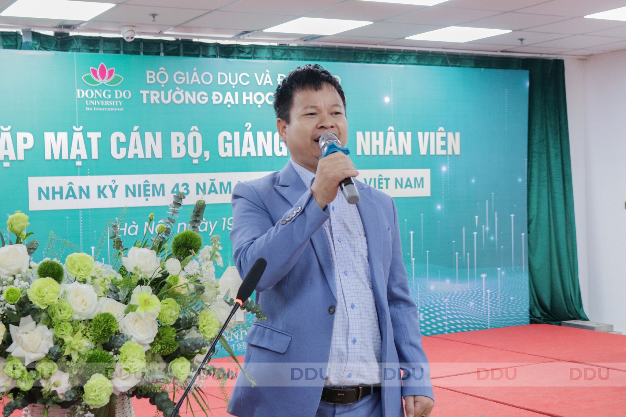 Phát biểu mở đầu buổi lễ, TS. Nguyễn Đình Tân – Phó Hiệu trưởng phụ trách Trường đã thay mặt Ban Giám hiệu gửi những lời chúc mừng tốt đẹp nhất tới toàn thể thầy cô nhân ngày 20/11. Thầy nhấn mạnh rằng mỗi bước tiến của Đông Đô hôm nay đều được xây dựng từ nỗ lực bền bỉ và trái tim tận tụy của đội ngũ giảng viên, những người đã lặng lẽ gieo mầm tri thức, nuôi dưỡng nhân cách và khơi dậy khát vọng trong mỗi sinh viên.