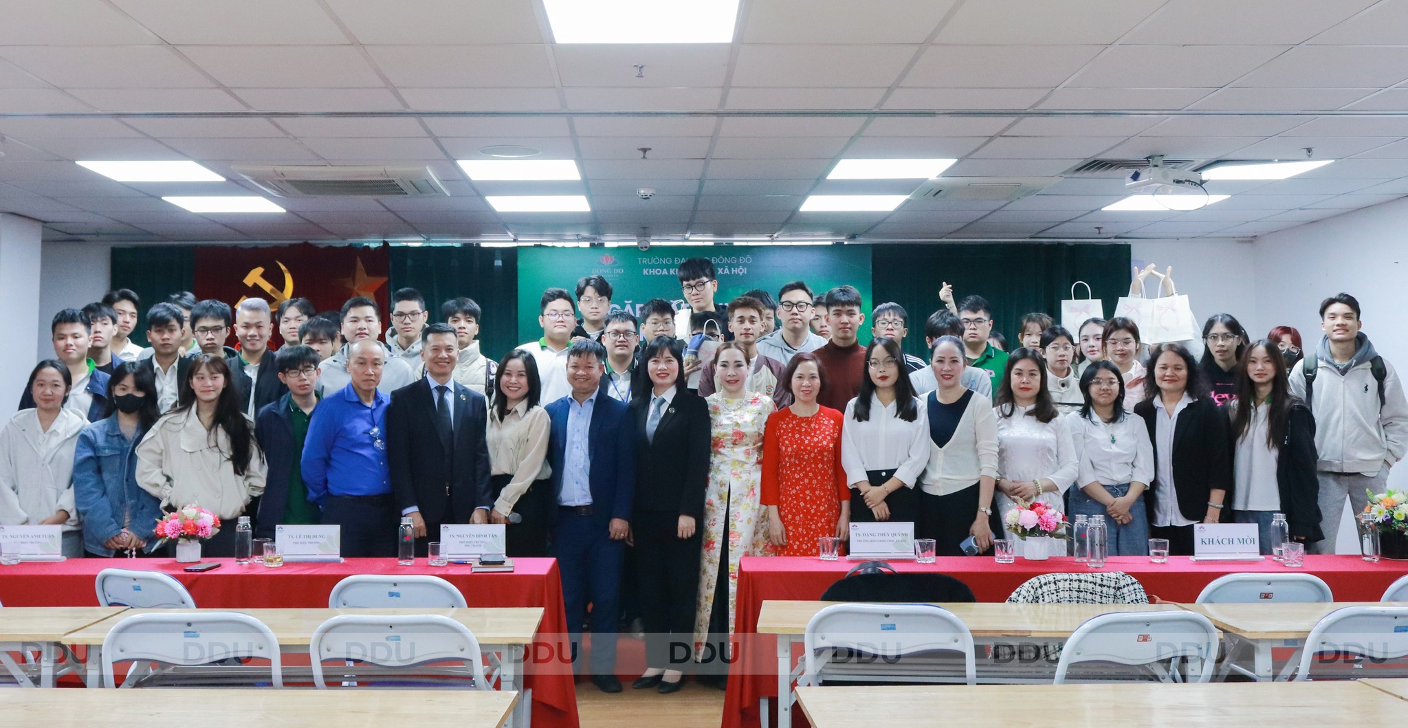 Buổi gặp gỡ diễn ra trong không khí trang trọng nhưng đầy ấm áp, với sự hiện diện của: TS. Nguyễn Đình Tân – Phó Hiệu trưởng phụ trách Nhà trường; TS. Lê Thị Dung – Phó Hiệu trưởng Nhà trường, Trưởng ngành Luật Kinh tế; TS. Nguyễn Anh Tuấn – Phó Hiệu trưởng Nhà trường; TS. Trần Xuân Hồng – Phó Trưởng phòng Đào tạo; TS. Đặng Thúy Quỳnh – Trưởng Khoa Khoa học Xã hội. Đặc biệt, chương trình vinh dự đón tiếp hai vị khách mời đặc biệt: Luật sư Nguyễn Thị Bích Hạnh – Trưởng Văn phòng Luật sư Hạnh Nguyễn, và Luật sư Hoàng Minh Hiển – Trưởng Văn phòng Luật sư HHM, Phó Trưởng Ban Hội đồng Khen thưởng – Kỷ luật, Đoàn Luật sư Hà Nội. Cả hai đều là cựu sinh viên tiêu biểu của Trường Đại học Đông Đô, nay đã trở thành những luật sư, chuyên gia và nhà quản lý thành đạt, trở về mái trường xưa để chia sẻ hành trình trưởng thành, truyền cảm hứng và định hướng nghề nghiệp cho các thế hệ sinh viên hôm nay. Cùng các thầy/cô giảng viên và toàn thể sinh viên các khoa thuộc Khoa Khoa học Xã hội.