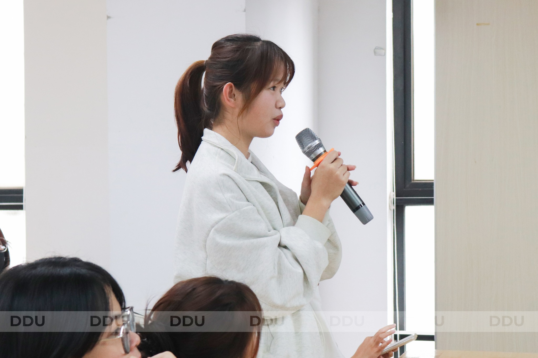 Tiếp theo, để giải đáp câu hỏi của sinh viên Trịnh Việt Hoàng về cơ hội thực tập và định hướng nghề nghiệp, TS. Lê Thị Dung – Phó Hiệu trưởng Nhà trường chia sẻ: “Nhà trường sẽ giới thiệu các em đến thực tập tại những cơ sở, doanh nghiệp đúng chuyên ngành, đồng thời tổ chức các buổi trao đổi định hướng nghề nghiệp để giúp sinh viên hiểu rõ hơn về công việc tương lai và chuẩn bị kỹ năng cần thiết cho hành trình lập nghiệp.”