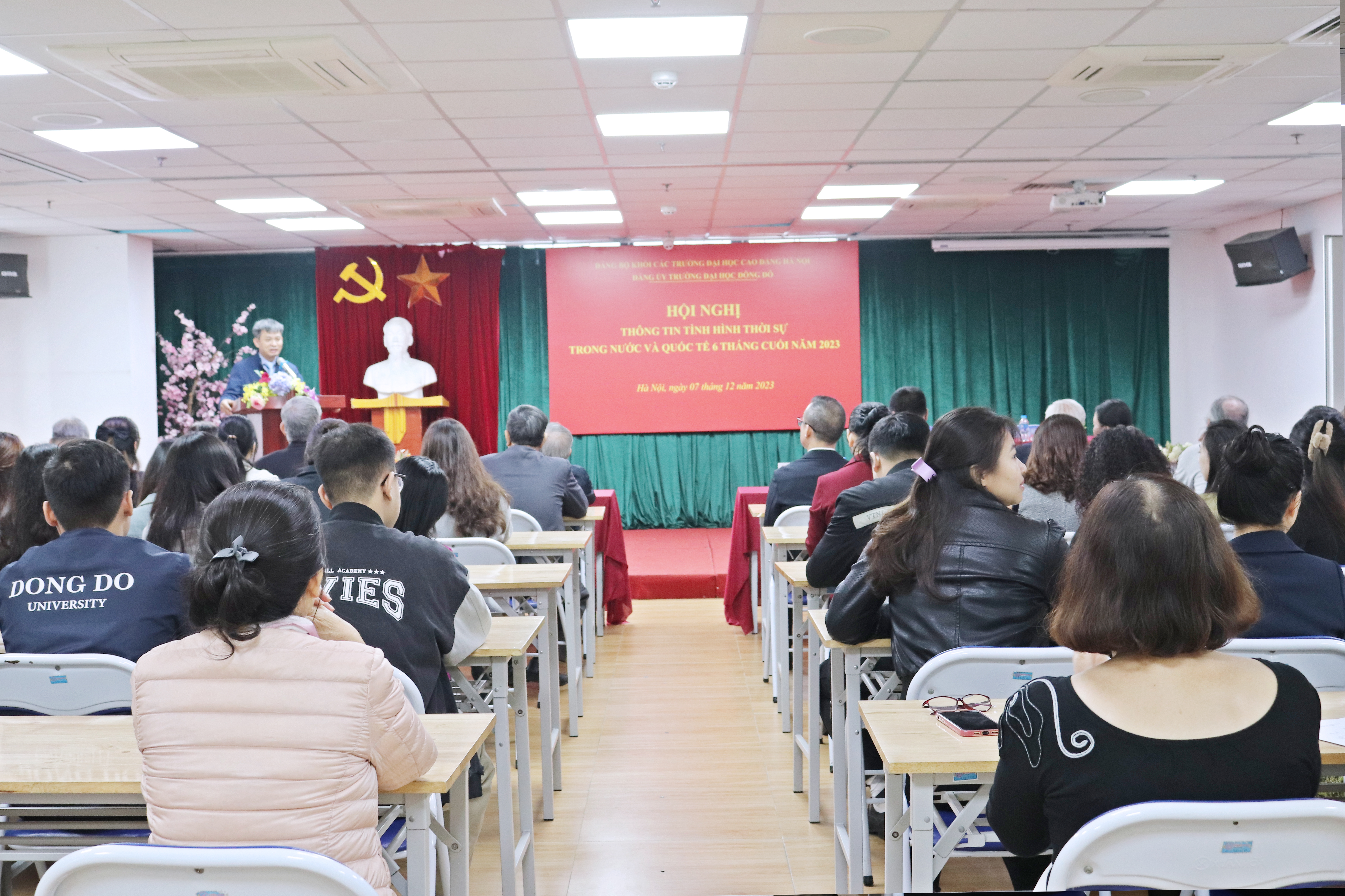 Thực hiện Kế hoạch Công tác Đảng năm 2023 của Đảng ủy Trường Đại học Đông Đô, Thực hiện Nghị quyết Số 38/NQ-ĐUDĐ/2023 ngày 16/11/2023 của Đảng ủy Trường Đại học Đông Đô về nhiệm vụ công tác tháng 11,12 năm 2023. Sáng ngày 7/12/2023, Đảng ủy Trường Đại học Đông Độ tổ chức Hội nghị thông tin tình hình thời sự trong nước và quốc tế 6 tháng cuối năm 2023.