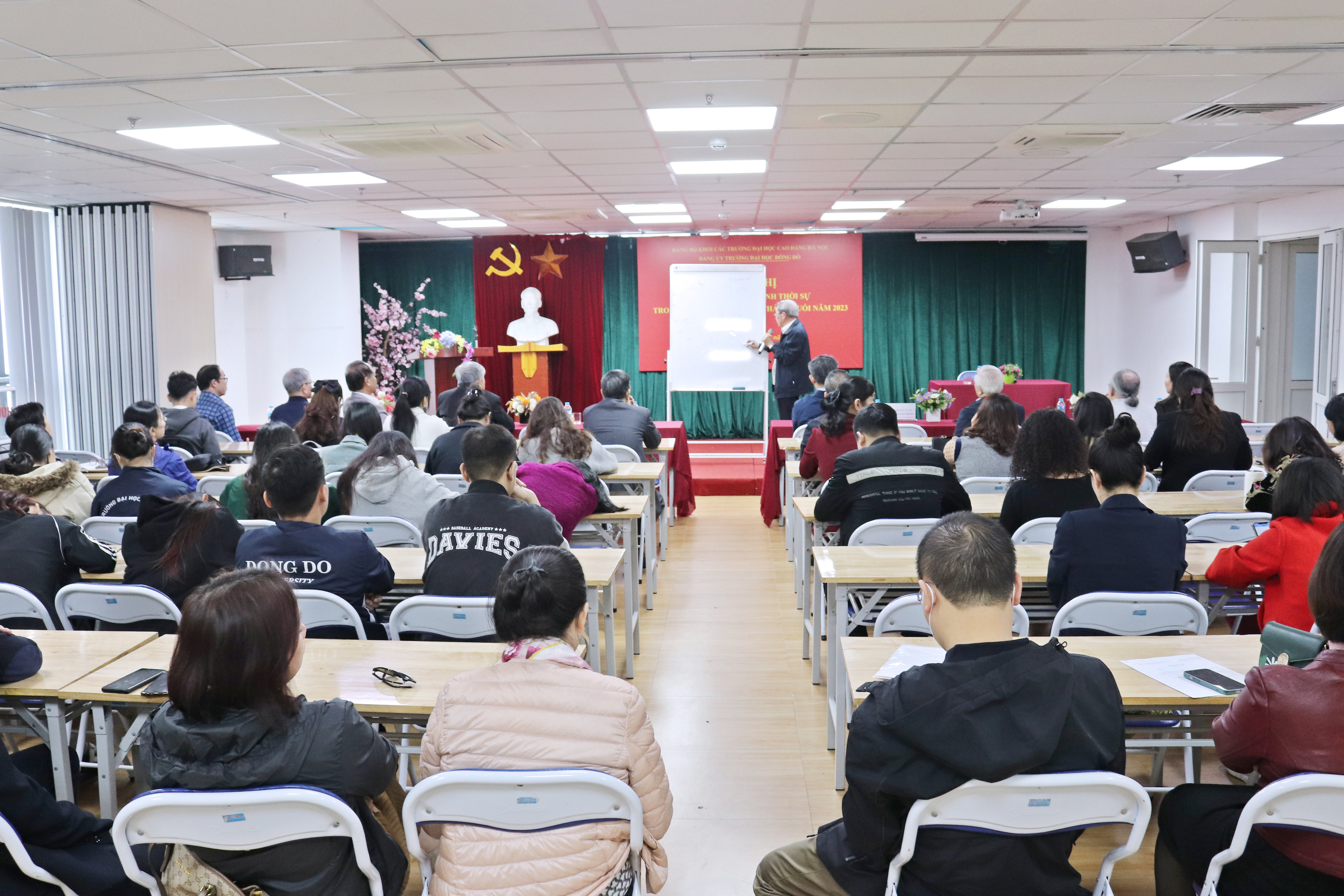 Phát biểu khai mạc hội nghị, TS. Đoàn Anh Tuấn – Bí thư Đảng ủy nhà trường nhấn mạnh, hội nghị là buổi sinh hoạt chính trị quan trọng của Đảng bộ nhà trường, nhằm cung cấp đầy đủ thông tin một cách toàn diện, chính xác, khách quan về tình hình thời sự trong nước, khu vực và quốc tế tới từng đảng viên. Từ đó, các đồng chí đảng viên hiểu, thực hiện và tuyên truyền đường lối chính sách đúng đắn của Đảng và Nhà nước tới tất cả cán bộ, giảng viên, sinh viên trong nhà trường.